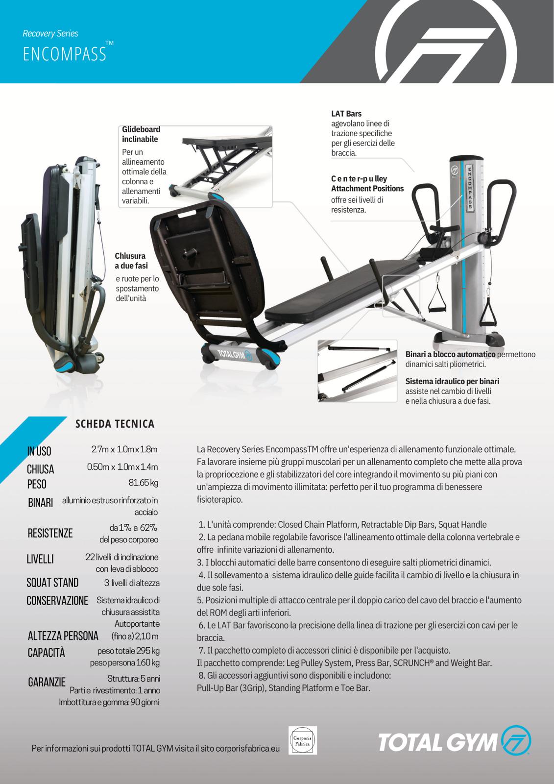 Total Gym RS Encompass ™ consente ai medici e fisioterapisti di costruire protocolli di trattamento specifici in riabilitazione e post-riabilitazione e modalità di allenamento in grado di accelerare i risultati per i pazienti per esigenze di vario tipo.